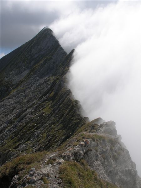 der Grat im Aufstieg: rechts Nebel, links Sonne
